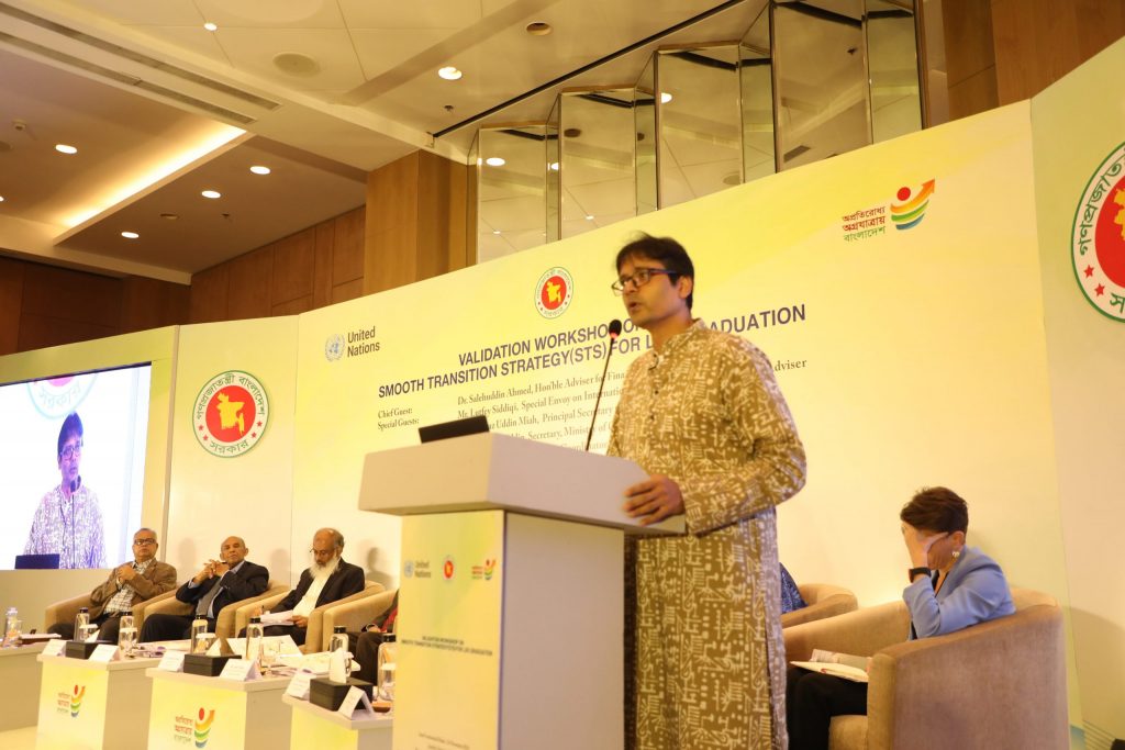 Hon’ble Finance Adviser Dr. Salehuddin Ahmed is speaking during the ‘Validation Workshop on Smooth Transition Strategy (STS) for LDC Graduation’ held in Dhaka on 24 November 2024